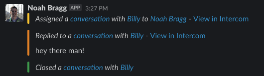 Anything that happens in an Intercom conversation will also be updated in a slack channel so others on the team can see how things are going.